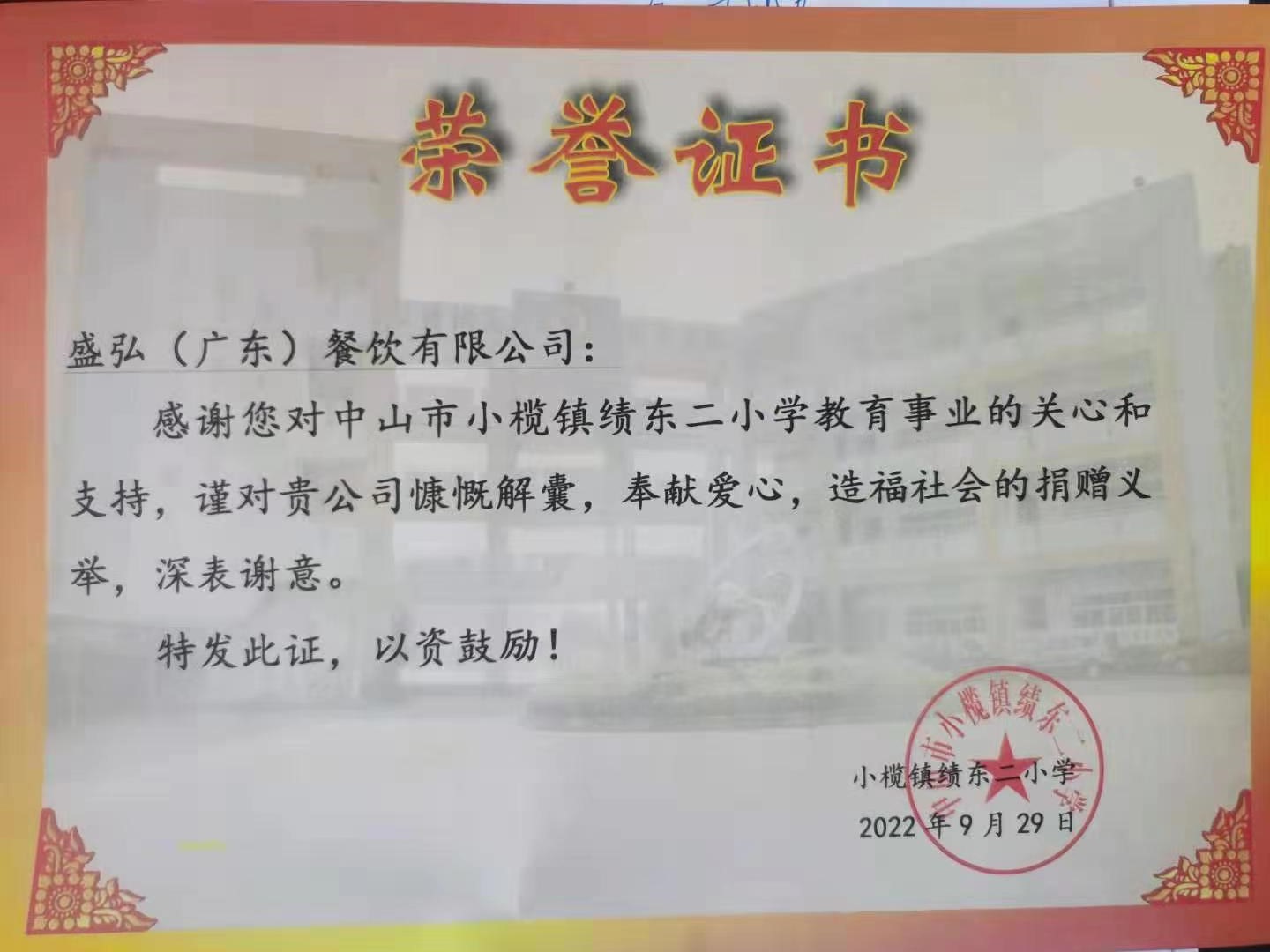 中山市小欖鎮績東二小學感謝盛弘(廣東)餐飲有限公司對教育事業的關心何支持,謹對貴公司慷慨解囊,奉獻愛心,造福社會的捐贈義舉,深表謝意。